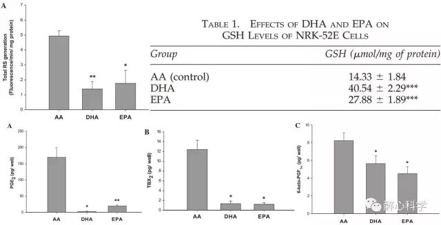 此外,鱼油还具有抗炎效果。主要机理是在代谢过程中,DHA能够产生抗炎的前列腺素PGH1,而EPA则产生具有抗炎活性的前列腺素PGH3,它们可以共同中和引起体内炎症反应的前列腺素PGH2的作用。You Jung Kim和Hae Young Chung发表在《Journal of Medicinal Food》的研究表明,在培养大鼠肾脏细胞的培养基中添加DHA和EPA可降低细胞的活性氧(ROS)水平,同时升高还原型谷胱甘肽(GSH)的含量,并降低细胞内炎症因子(如thromboxane B2、PGE2以及 6-keto-PGF1)的水平。此外,Yoshikazu Ohtsuka等人的研究表明,在大鼠的幼崽坏死性结肠炎模型中,肠中DHA与EPA浓度升高会导致抗炎前列腺素E2的受体EP3表达上调,抗炎转录因子PPARγ表达增加,促炎转录因子NFκB活性降低,由此可降低结肠炎的发生率。根据衰老的炎症学说,慢性炎症可能是衰老过程中一个关键因素, 因而DHA和EPA可能通过抗氧化和抗炎作用起到延缓衰老的目的。