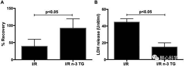 此外,小鼠心肌缺血再灌注模型的相关研究也显示出ω-3多元不饱和脂肪酸对心肌的保护功能。研究者分别利用小鼠体内急性闭塞的冠状动脉左前降支(LAD)模型及心脏离体灌注(LT)模型进行实验。在急性闭塞的冠状动脉左前降支模型中,注射富含n-3 (ω-3)的甘油三酯(TG)乳剂(1.5g/kg体重)可显著减少心肌梗死面积,维持心脏功能;在心脏离体灌注模型中也显著促进了机能修复。此外,两个模型中标志心肌损伤程度的乳酸脱氢酶水平在给予n-3 TG后均发生了明显下降,表明急性n-3 TG注射提供了有效的心肌保护。