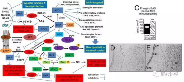 除了心血管疾病,衰老引起的大脑功能退化,包括记忆与行为的改变也严重影响着老年人的生活质量。甚至有报道指出,神经退行性疾病的发病率将会超过心血管疾病。研究发现在动物个体中除了脂肪组织以外,大脑是含有脂质最多的器官。大脑中35%的脂质是长链多不饱和脂肪酸(Lc-PUFA),大脑中的脂质主要起到保持正常的细胞膜结构、突触传递、电位平衡、囊泡运输等作用。DHA作为大脑中的多元不饱和脂肪酸的主要成分之一,大量存在于神经细胞和视网膜细胞膜上,在大脑的发育与认知功能的维持中发挥重要的作用,与抑郁或老年痴呆等神经退行性疾病关系密切。2016年3月, Mounir Belkouch发表在《Journal of Nutritional Biochemistry》的综述表明在阿尔兹海默症患者的大脑中,DHA的含量显著下降。通过对正常老人进行DHA干预,能改善老人的认知紊乱。Fre´ de´ric Calon等人的研究表明,DHA可以激活神经细胞的PI3K/Akt/BAD信号通路。DHA的减少会使神经细胞的树突受到损伤,进而影响神经信号传递,最终造成认知障碍。同时Fre´ de´ric Calon等人对阿尔兹海默症模型的两组小鼠分别饲喂高DHA和低DHA含量的食物,发现高DHA饲喂的小鼠PI3K信号通路激活及磷酸化的BAD水平升高,从而减少了神经细胞的凋亡。这些证据都提示了鱼油中的DHA能改善神经退行性疾病,具有促健康和延缓衰老的作用”