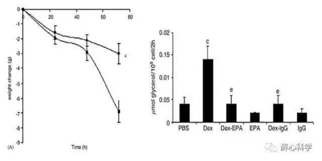 鱼油中的另一成分EPA也具有抗癌效果。恶病质诱导的小鼠肿瘤(MAC16)中锌-α2-糖蛋白(ZAP)高表达。锌-α2-糖蛋白能够促进脂肪降解,破坏脂肪组织,导致小鼠体重下降。而EPA(0.5g/kg)能够通过下调锌-α2-糖蛋白的表达来保护脂肪组织,起到抗肿瘤的作用。