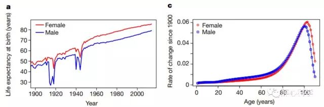 这项研究发现从1900 年起,不同国家普遍呈现出老年人口(70岁以上)死亡率降低的现象。并且出生年份越晚的人,长寿的人数越多,从一定程度上证明人类的平均期望寿命在不断提高。但当关注1900年以来不同年龄人口的增长率时,却发现增长率在100岁左右达到顶峰,之后迅速衰减。这暗示着超过100岁后死亡率的下降速度在变缓,因而人类的寿命可能接近了上限。