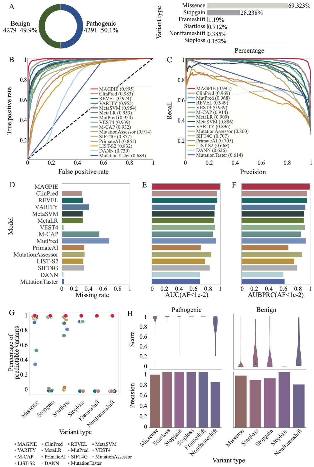 研究人员分别在三个不同的数据集,分别是ClinVar与gnomAD混合数据集independent test set、SwissProt与gnomAD混合数据集orthogonal validation set、由ACMG指导的临床验证数据集ACMG-guided dataset中对MAGPIE的性能进行了评估,其中independent test set为类别平衡数据集,即阳性样本与阴性样本数基本一致;orthogonal validation set中阳性样本占比超过90%,ACMG-guided dataset中阳性样本占比不足20%。研究人员发现MAGPIE可以在多种类别分布的数据集中稳定的实现0.95以上的AUC,0.88以上的AUPRC,以及0.9以上的准确率(accuracy)。MAGPIE同样在各数据集中准确预测所有变异类型,能够在移码变异(frameshift)、提前终止变异(stopgain)等变异类型中有均超过0.85的准确率。
